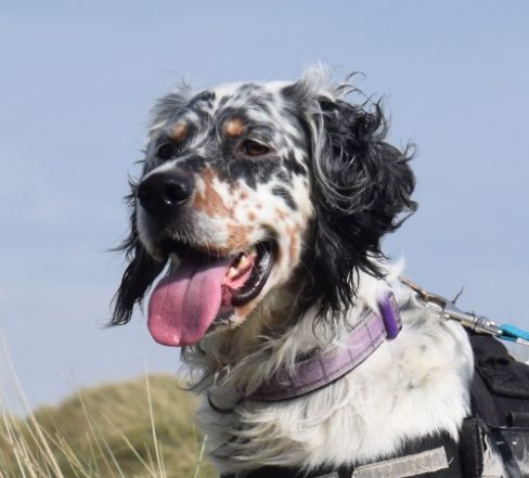 Monty is an English Setter who came in as an emergency foster to live with Lavinia in September 2019. He was very stressed and anxious, very nervous about being stroked, had absolutely no recall, and was very underweight. He used to tear about the place and disappear for ages on end trying to catch wild birds. After a lot of patience, a lot of TLC, and daily walks on and off the lead, this is the same dog now relaxing in his home.
